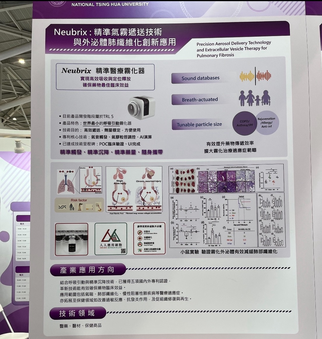 研究團隊進一步指出,外泌體具有天然的免疫調節與抗發炎特性,經過吸入後能直接作用於肺部病灶,不僅提高治療效率,也降低全身性副作用風險。透過新型精準氣霧遞送技術「Neubrix®」結合高品質外泌體,此技術已達到成熟度(TRL)第5階段,顯示具高度臨床應用與商品化潛力。